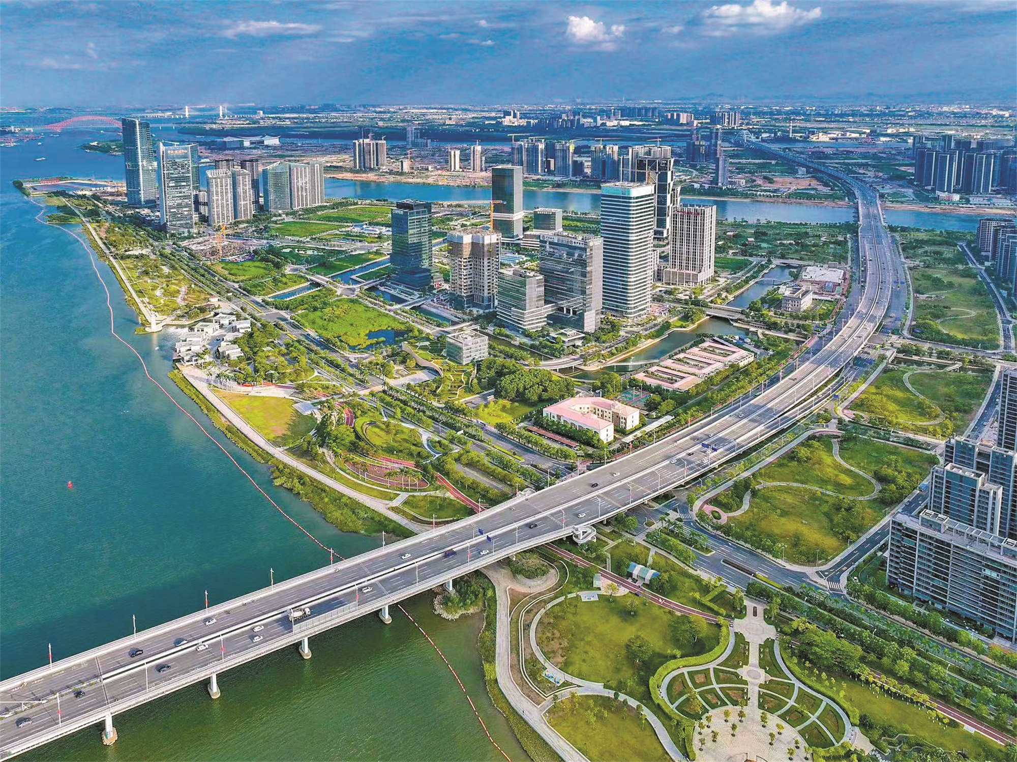 ㎡,是明珠湾起步区开发建设的重点区域,在交通布局上打造“二横四纵”路网格局。